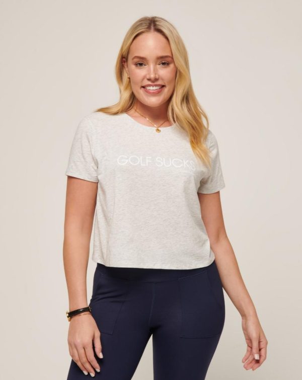 Show off your “love” for the game with the TEN FOR TEN women’s t-shirt. Whether you’re frustrated from your last over par round or just trying to send a message, our “Golf Sucks” graphic will get the job done. Designed with a modern, slightly cropped silhouette, you can be as confident in your look as you are in your game.
